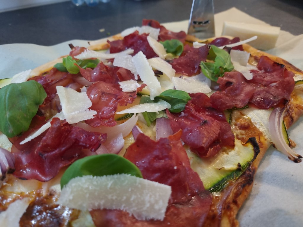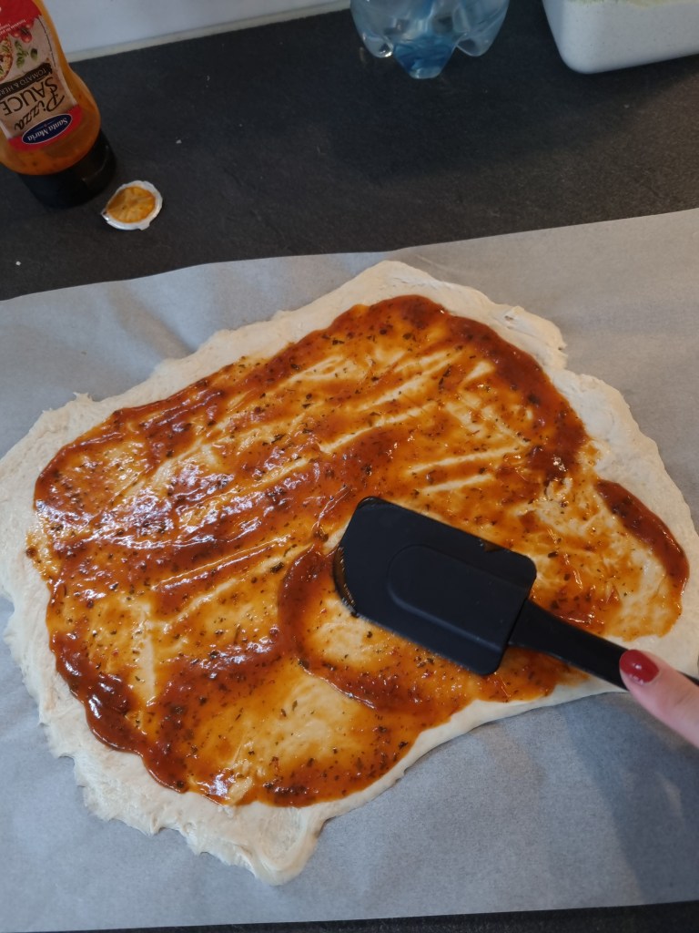 - Kavla ut pizzadegen och lägg på två bakplåtspapper