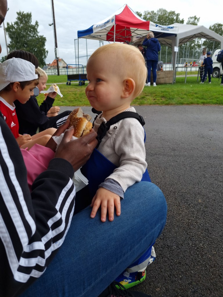 Förra helgen hade Lukas fotbollsklubb en heldag på deras IP. Så när Lukas och kusinen Steven spelat sin match blev det grillade hamburgare till lunch. Ludvig gick fram och tillbaka längst gänget och tiggde till sig mat. Tur att han har sin bästa vän Joelle (min svägerska) som bjuder han på en massa gott 🙂 Tycker mig se en massa kärlek i Ludvigs blick, vet inte om det är till Joelle eller hamburgaren ❤