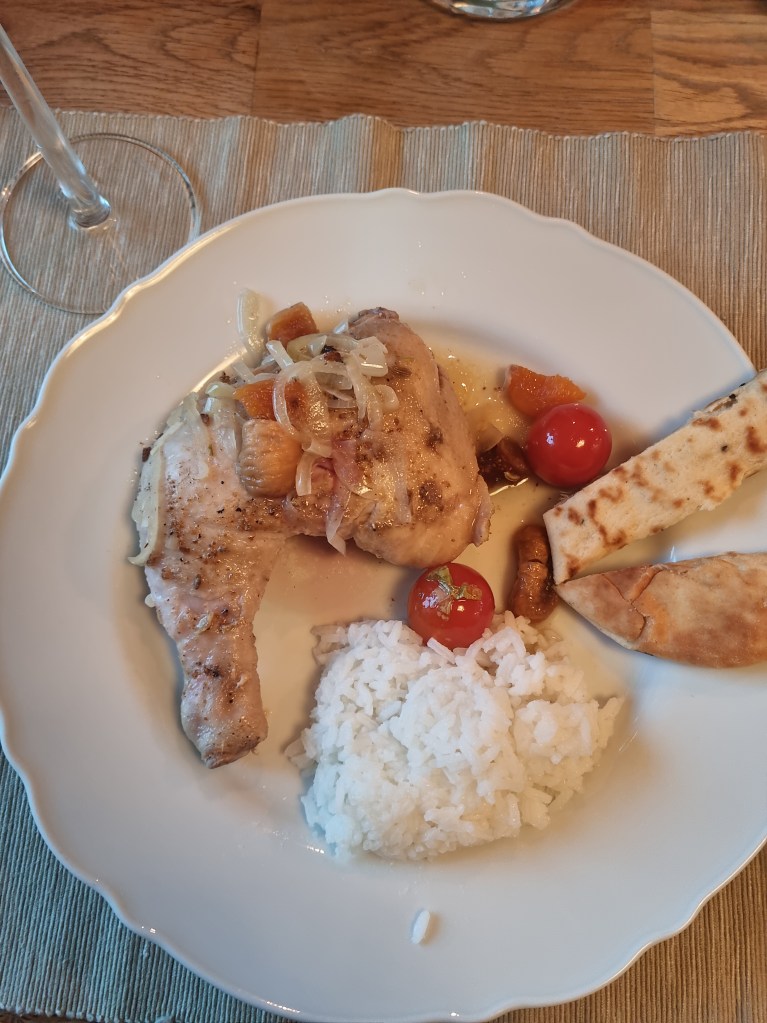 I den stod en väldigt god kycklingrätt och tillagades. Kycklingen blev otroligt mör och god. Jag återkommer med recept på både förrätten och kycklingen.