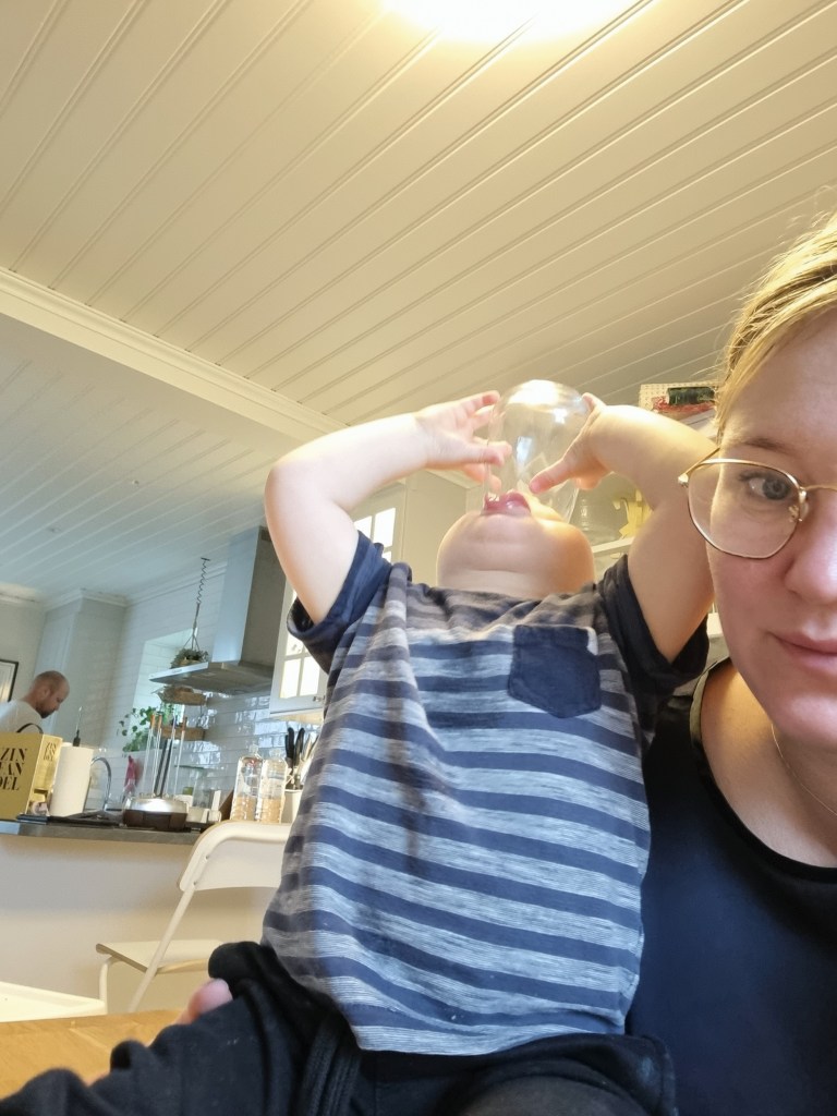 Såhär kan man också dricka fredagsdrinken 🙂 Killen som oftast lyckas dricka med hela ansiktet för det går fort att vända upp glaset. Men det gör inget om man är ett år och tycker att det är något av det roligaste som finns att dricka ur ett glas.