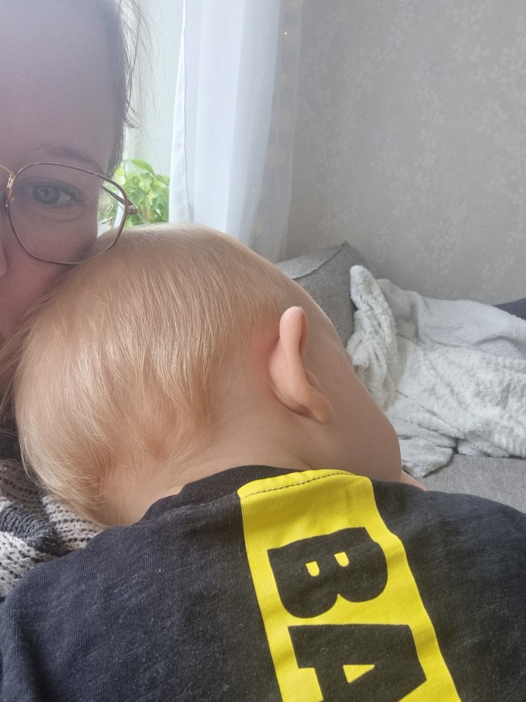 Tänkte att jag skulle kunna jobba lite samtidigt med så här sitter vi i soffan. Han är bara nöjd om han får ligga i min famn ❤️