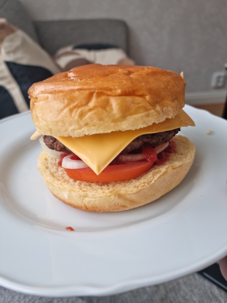 Igår hade resten av familjen ätit hamburgare till middag, och det blev en över till mig. Så till lunch värmde jag på köttet och slängde ihop en burgare. Få saker som slår hemmagjort, och att det är enkelt gör ju saken bara bättre. Briochebrödet är det absolut godaste.