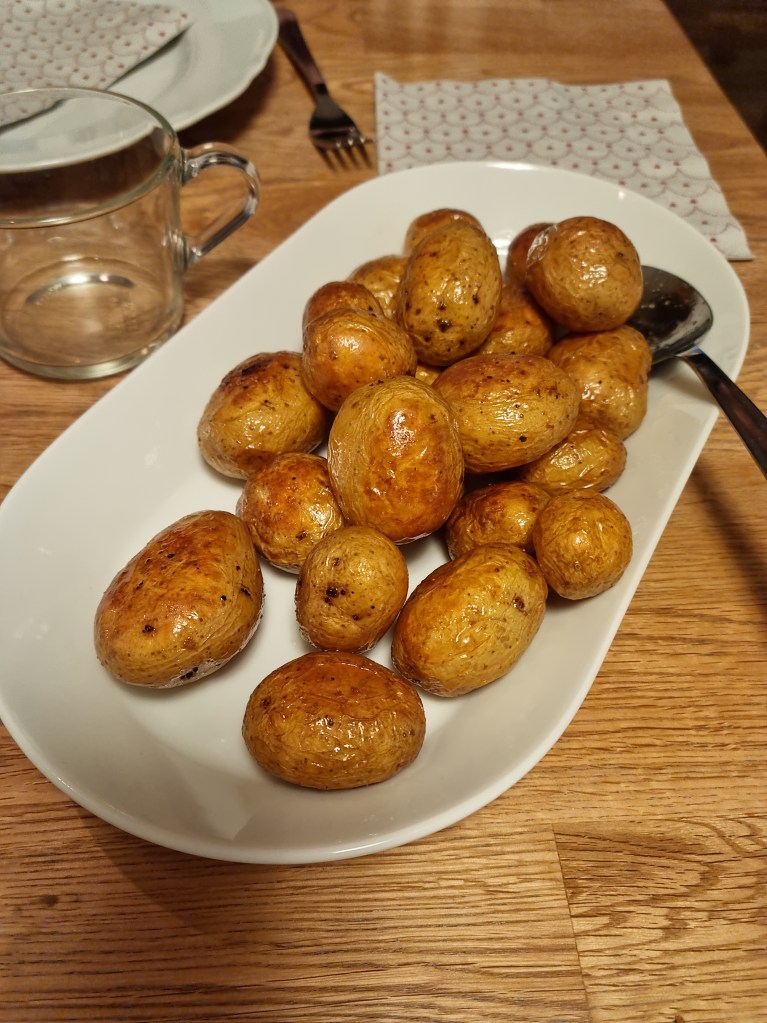 - Blanda potatis, 3 msk olja och salt och svartpeppar i en ugnsform och rosta potatisen i ugnen 30 minuter.