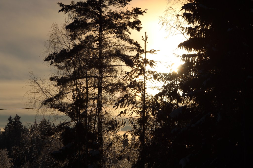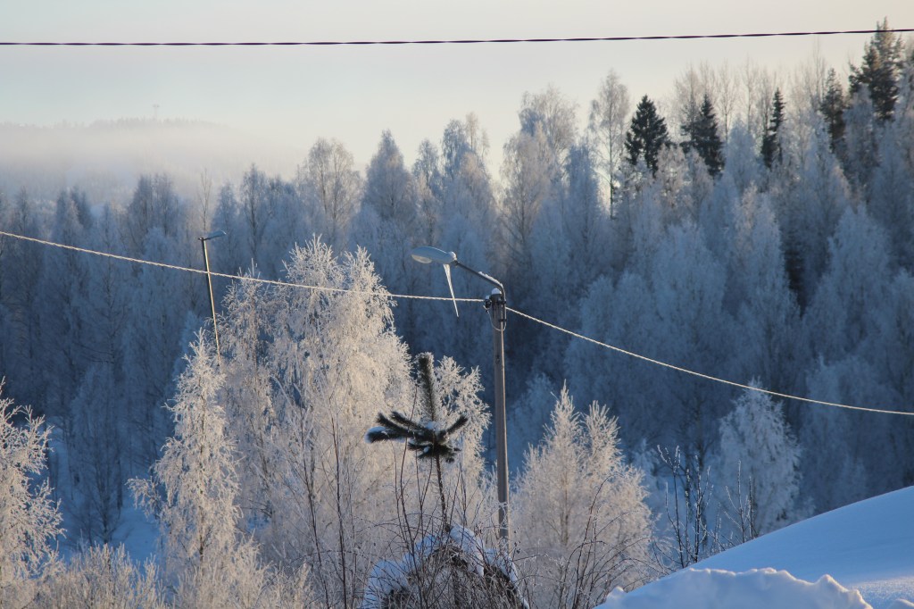 En positiv sak är att det är så magiskt vackert ute. Allt liksom glimrar på ett lite magiskt sätt. Vi som har utsikt mot skidbackarna kunde knappt se dessa genom allt soldis.