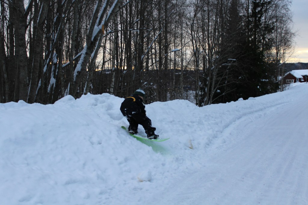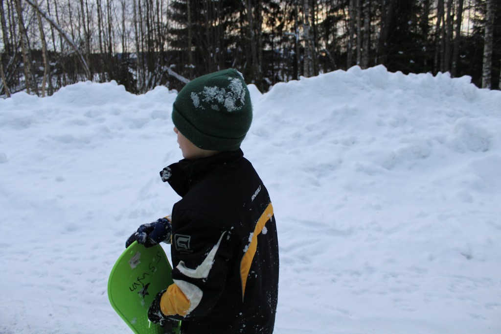 Innan skolan och förskolan började för grabbarna tog vi en promenad i byn. Lukas tog med sig den bästa julklappen, en snowboard från Stiga. En sån som man åker i pulkabacken med. Han älskar den och tycker att det är så roligt att åka.