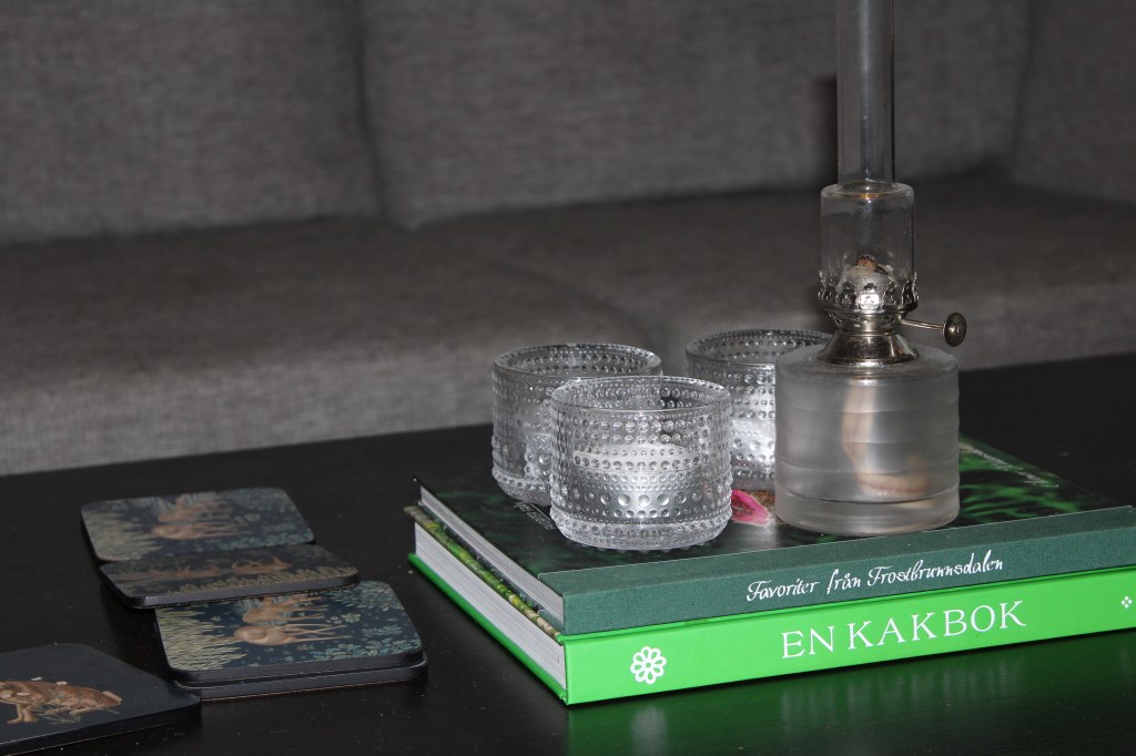 Bredvid böckerna ligger glasunderlägg som jag fått av min fina vän, dock får de aldrig ligga i ordning då minstingen är där och drar runt dem hela tiden.