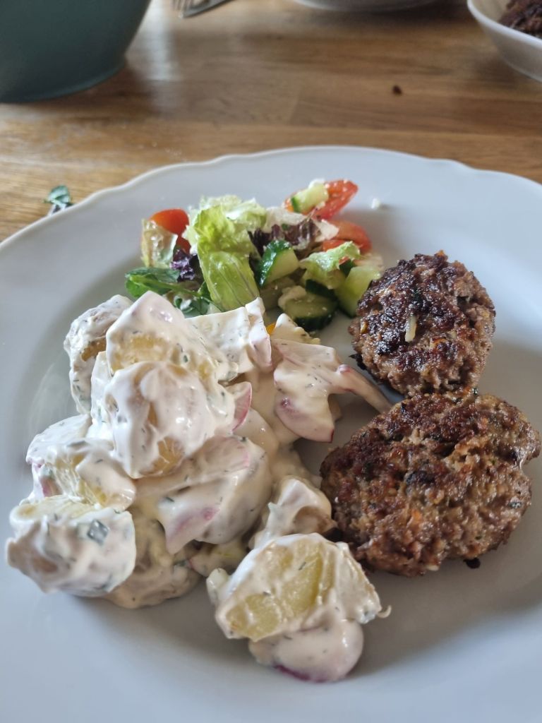 Även maten andades sommar. En hemmagjord potatissallad med färsbiffar. Fräscht och gott. I potatissalladen hade jag även i rädisor och salladslök vilket gjorde att den fick en härlig krispighet.