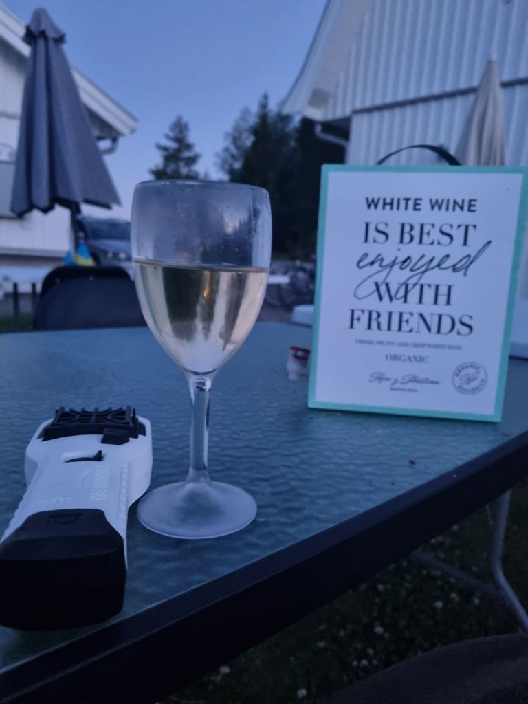 Efter en heldag av firande så har nästan alla gäster åkt hem. Jag sitter själv kvar ute och det är ljust. Det är jag, ett sista glas vin, myggdödaren, fåglarna och sommarnatten. Barnen har smugit in i huset, inlockade av värmen då en svensk sommarnatt är ganska kall 😂