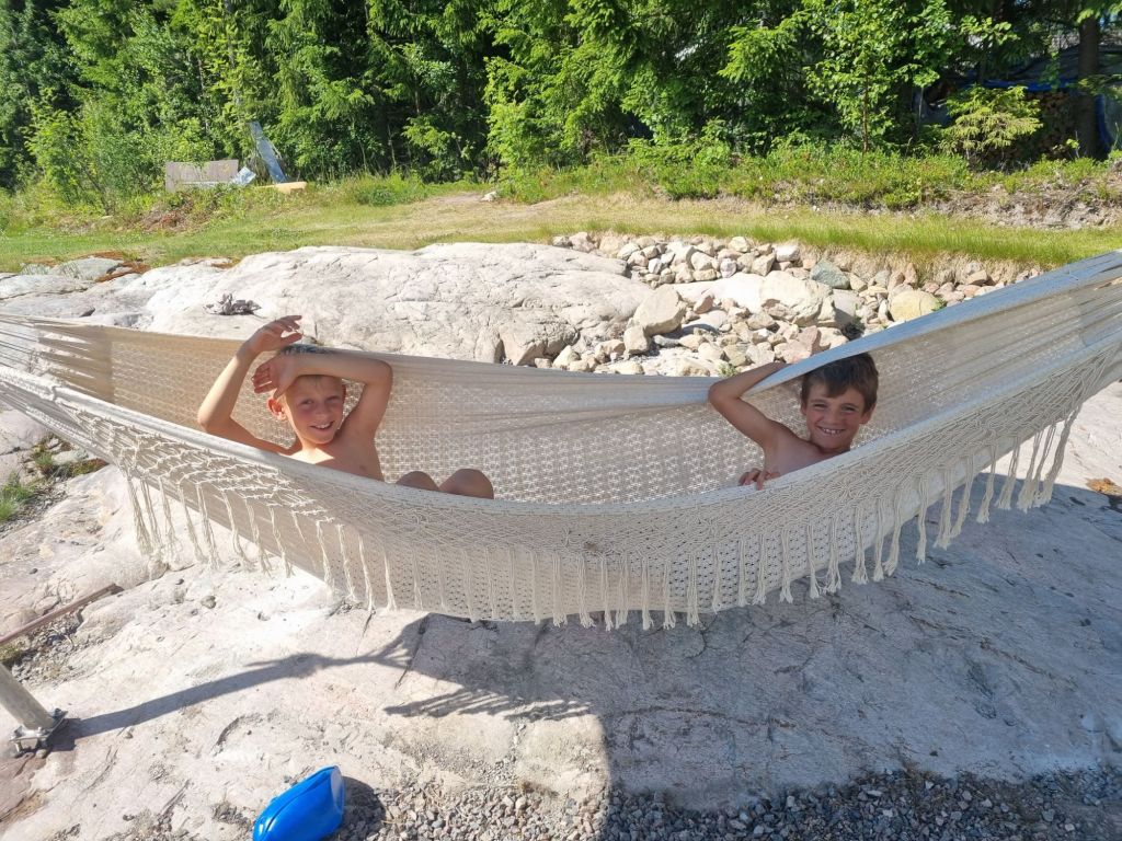 Igår så installerade Josef hängare för våran hängmatta som vi köpte i Mexico för en herrans massa år sen. Den blev dagens höjdpunkt och så härlig att vila i. Om jag får som jag vill kommer det plöjas en rad böcker här i sommar. Först ska vi bara överleva en fotbollsturnering som startar imorgon. Sen blir det vila och semester på riktigt.