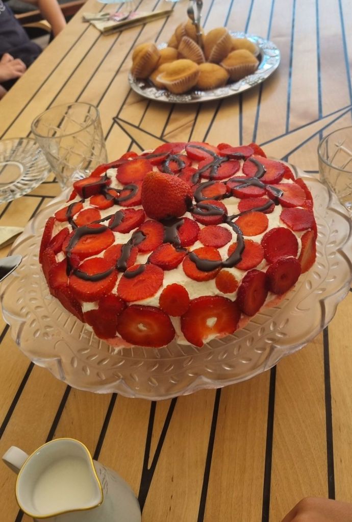 Igår firade vi pappa i förskott då han jobbar på sin födelsedag. Det bjöds på fika och självklart en jordgubbstårta. Det var en marängtårta som var väldigt god. Passade perfekt i värmen.