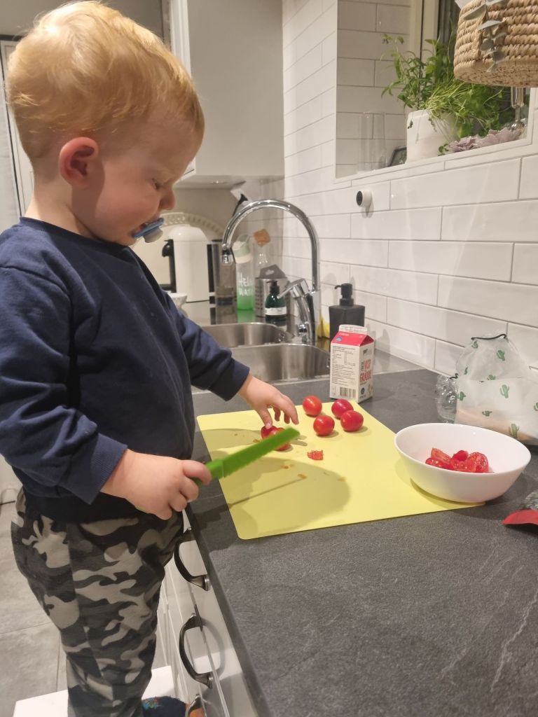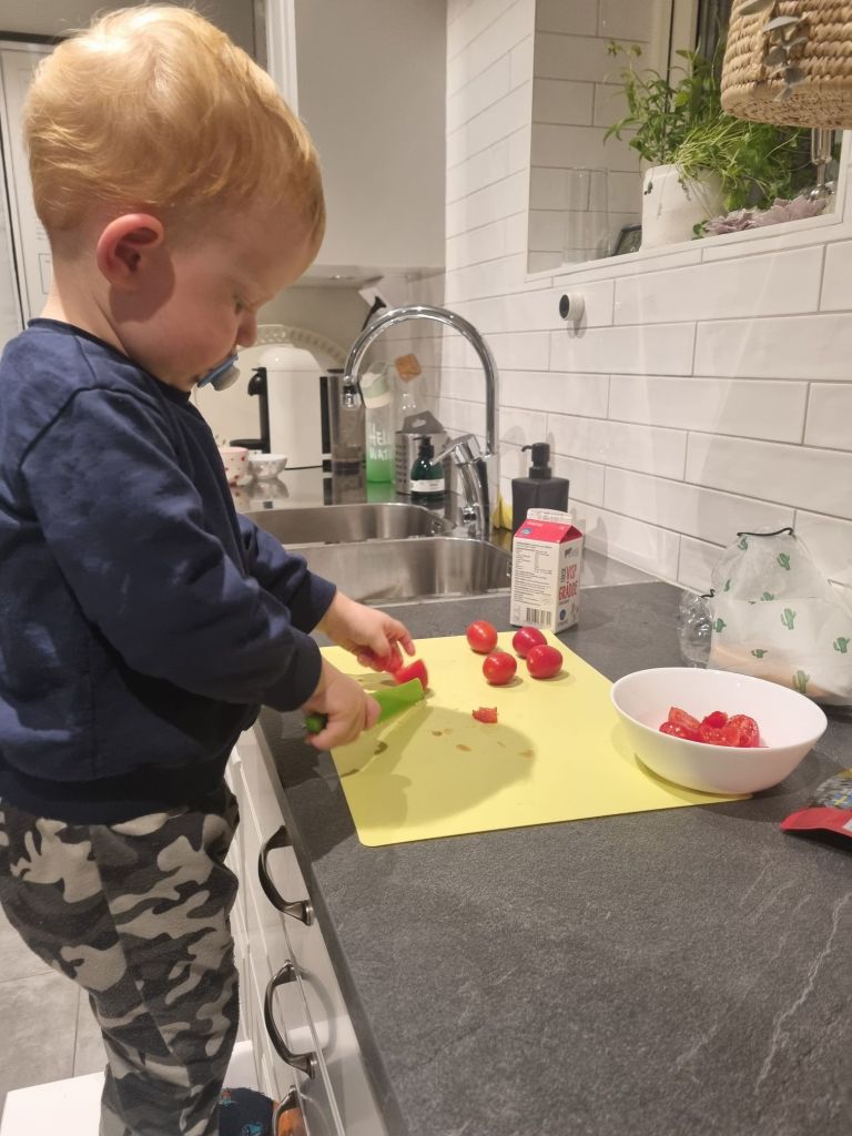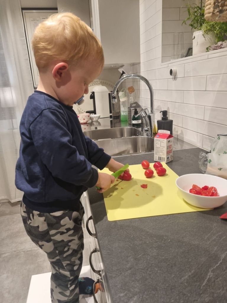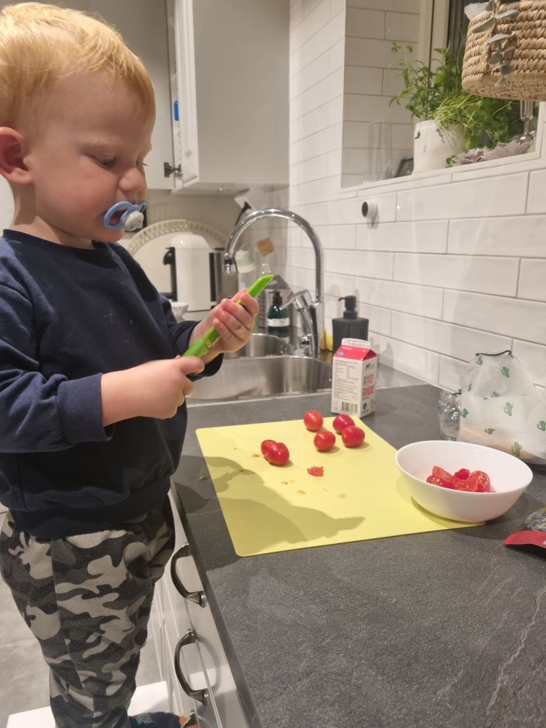 Igår fick jag hjälp av den blivande lilla kocken. Han har fått ett knivset med plastknivar som funkar bra att skära med, men ingen risk att han skär sig själv. Och oj, vad roligt han tycker att det är. Han fixade tomaterna medans jag slängde ihop en pasta Carbonara. Perfekt vardagsmat som går fort när energin tryter.