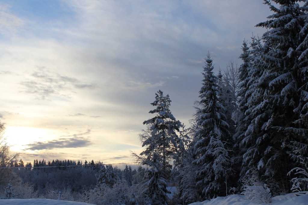 Hittade denna bild som jag tog på julaftonsmorgonen. Så himla vacker himmel, var som en tavla. Hela julafton var helt magisk med snön som låg över träden och allt var vitt och fint.
