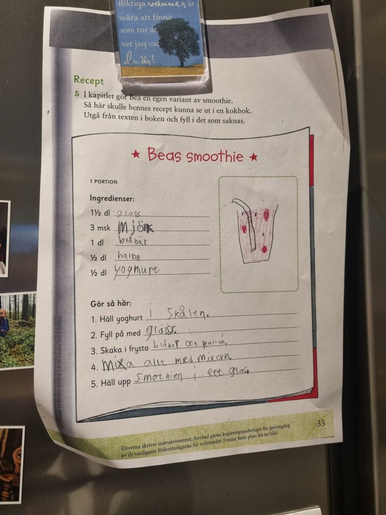 I helgen ska vi göra smoothie efter Lukas skolarbete. Han kom hem med receptet och tyckte att det kunde vi väl laga, så det gör vi. Lyxa till söndagsfrukosten lite. Gillar när man äter frukost länge, ingen stress till något. Det får vi nog av under vardagsmorgnar.