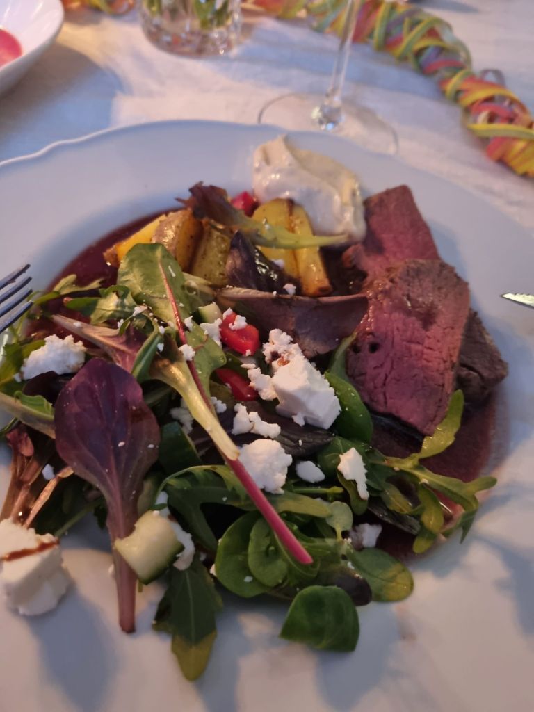 Josef fyllde år den här måndagen, så vi lyxade till det med att ugnssteka en rostas som jag serverade med klyftpotatis, rödvinssås, parmesanröra och en sallad. Det blev verkligen så himla gott.