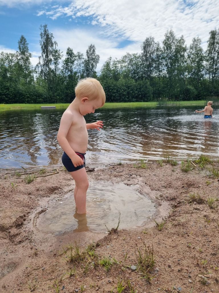Lukas har en kompis på besök, och det dröjde inte länge förrän de undrade om vi kunde åka ner till vår lilla sjö för ett dopp. Självklart! Ludvig hade så bråttom att han hoppade i två olika skor innan vi ens hunnit ut genom dörren 😂