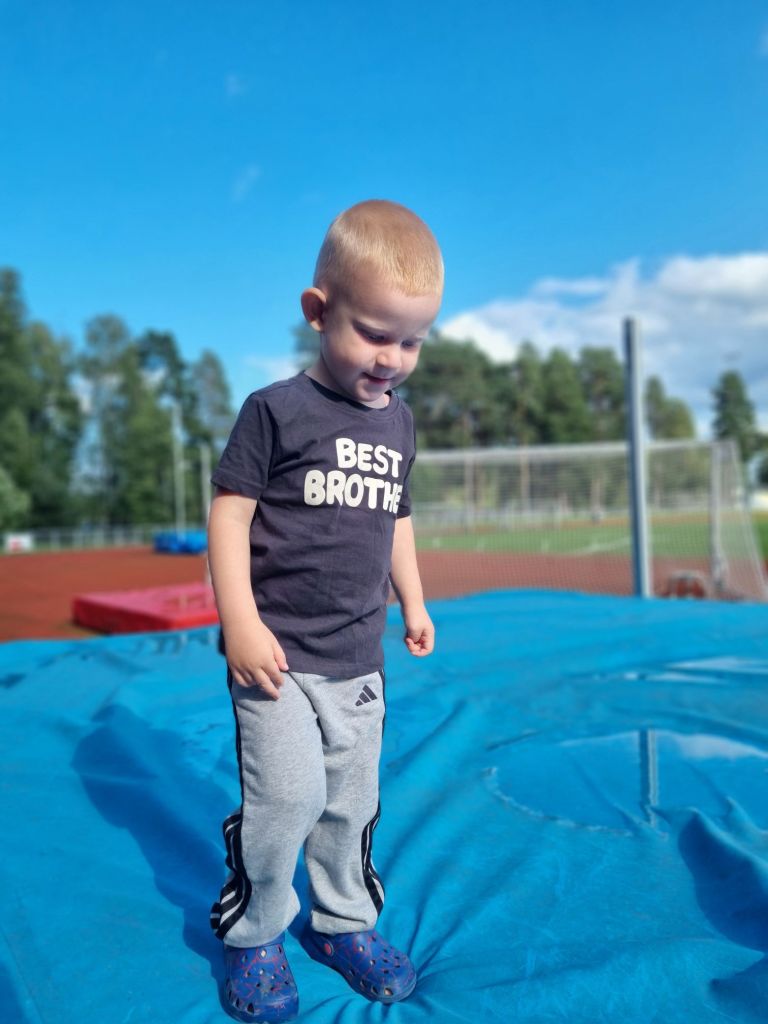 Efter frisörtiden hängde vi med på Lukas fotbollsträning. Ludvig passade på att hoppa på madrasserna för höjdhopp – och lyckades blöta ner sig ordentligt. Så vi åkte hem till brorsan och hängde där tills träningen var slut.