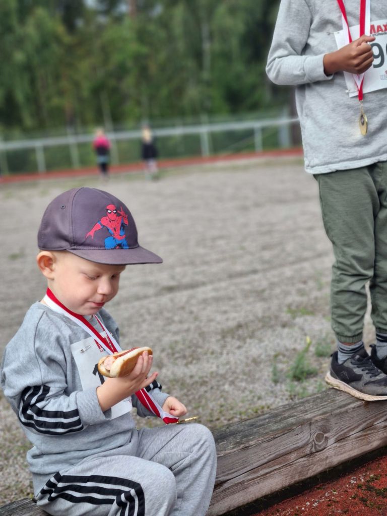 Efter målgång så fick de medalj. Matchande i gråa tröjor och Spider-man kepsar. Ludvig är övertygad att de vann 🥇🏆