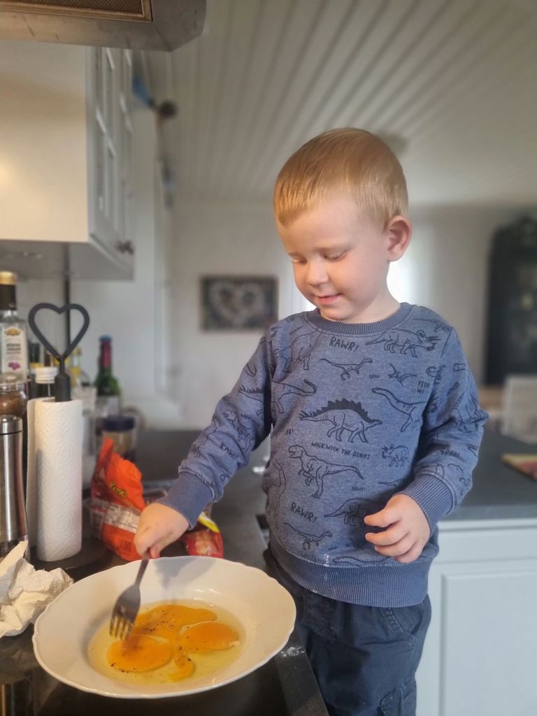 Igår hjälpte han till att vispa äggen till paneringen, men det roligaste han vet är att salta och peppra. Särskilt sen vi skaffade elektriska kvarnar där man bara trycker på en knapp – det är tydligen väldigt fascinerande! 😄