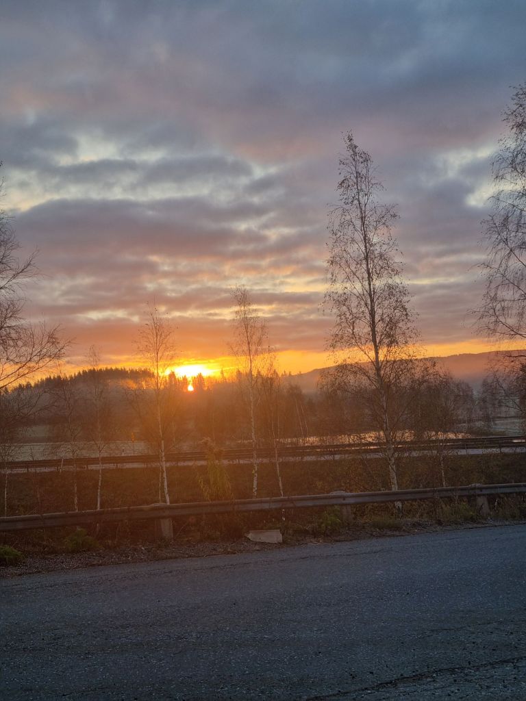 Vilken magisk morgon det var idag. Efter att ha lämnat barnen på skolan och förskolan stannade jag till för att hämta posten – och då fick jag även en chans att njuta av den fantastiska soluppgången. En lätt dimma låg över dalen nedanför oss och skapade ett nästan sagolikt sken. Det är verkligen nu naturen visar sig från sin allra vackraste sida. Jag älskar den här tiden på året. 🍂