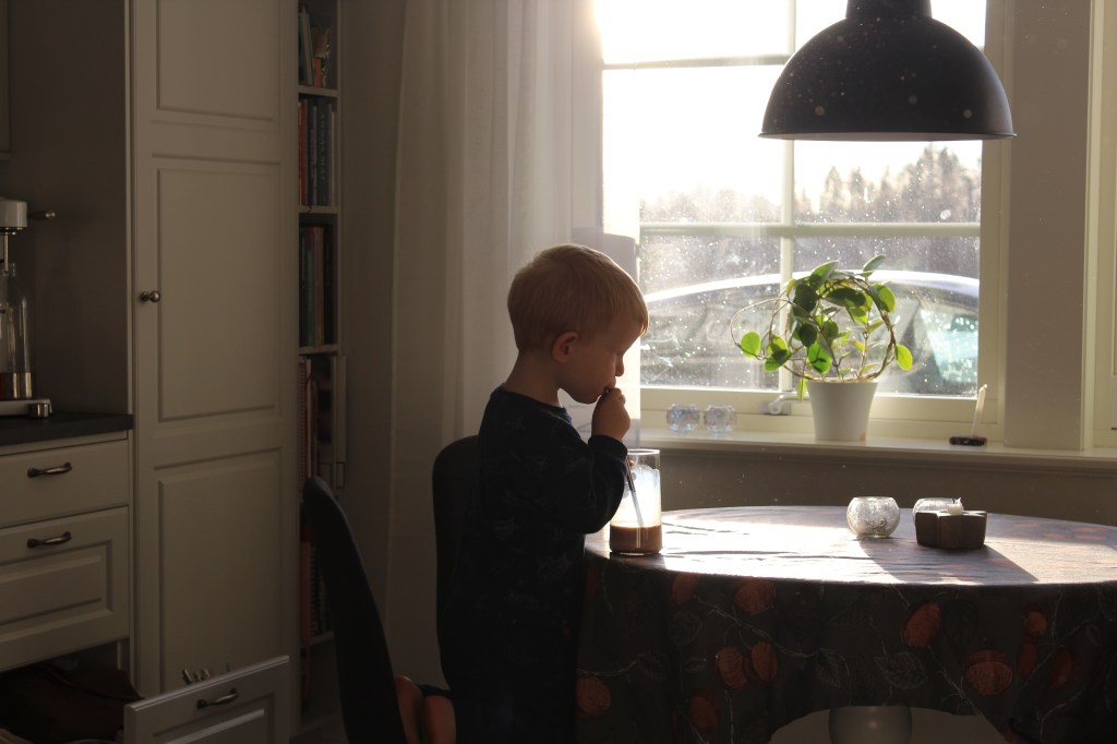 I helgen hade vi en sådan där riktigt lång och härlig frukost som bara fick dra ut på tiden. Medan jag satt och sörplade på mitt kaffe drack Ludvig sin O’boy genom sugröret, helt inne i sin egen lilla morgonvärld. Ljuset från den låga höstsolen föll in så vackert genom köksfönstret att jag bara var tvungen att ta fram kameran. Det där mjuka motljuset, stunden, lugnet – ett sånt där litet ögonblick i vardagen som man vill spara för alltid.