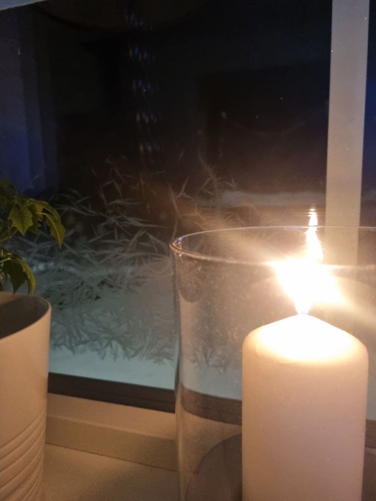 Ovan är den vackra frosten på rutan som vi hade förra veckan. Nu är den borta och så är även snön. Trist, men den hinner komma tillbaka.