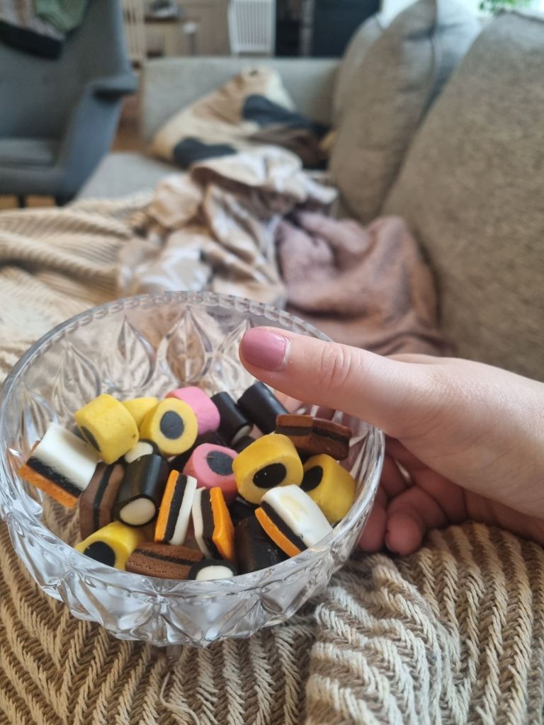 När man har bäddat ner sig i soffan, och är hängig, då får man äta sånt här godis. Och det är bara jag i familjen som verkligen älskar engelsk konfekt, så jag får ha den för mig själv.