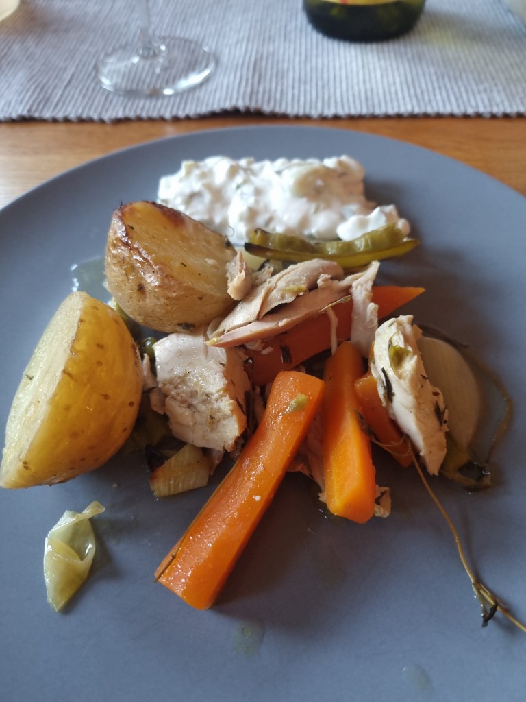 Pot-au-feu är en varm och inbjudande gryta där grillad kyckling möter varsamt ugnsrostade grönsaker. Väldigt gott.