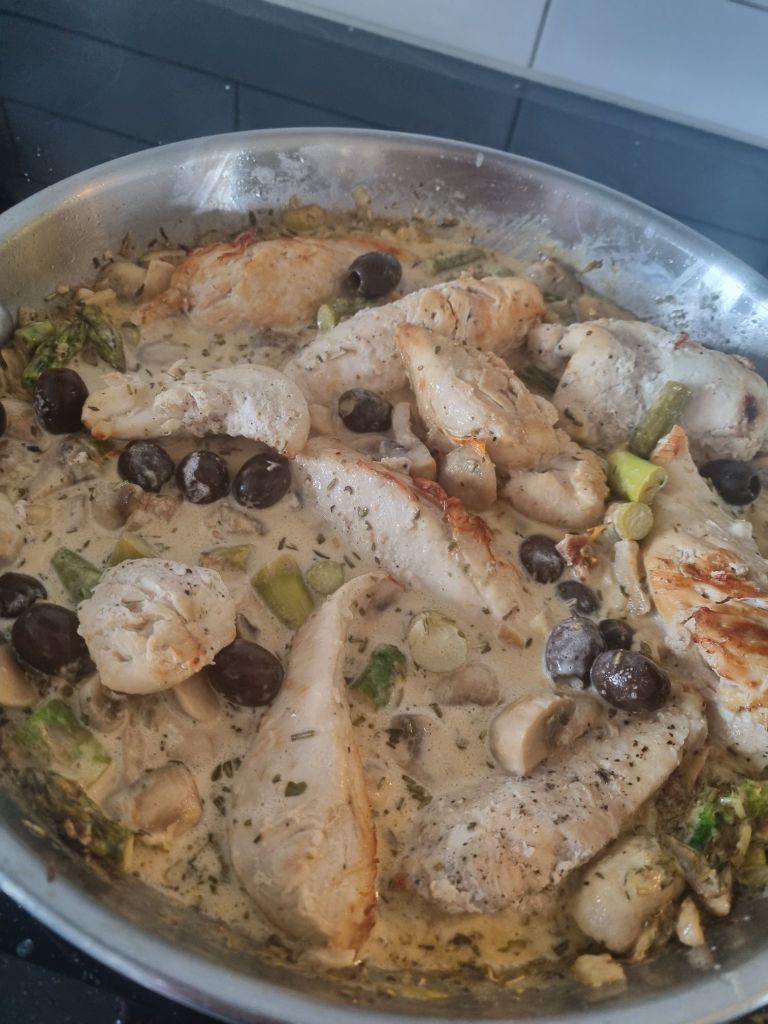 - Rör ner oliver och lägg ner kycklingen vid servering.