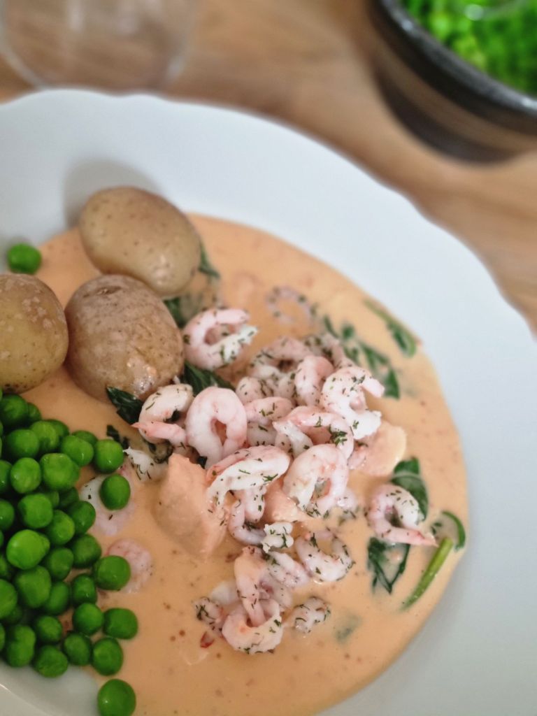 - Servera direkt med räkor, potatis och gröna ärtor.