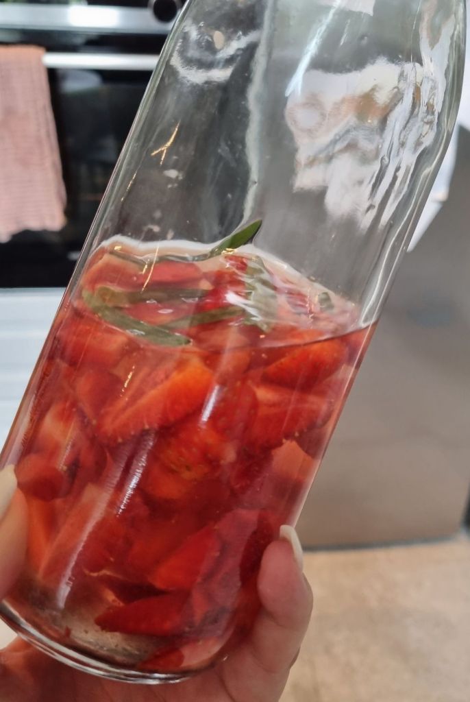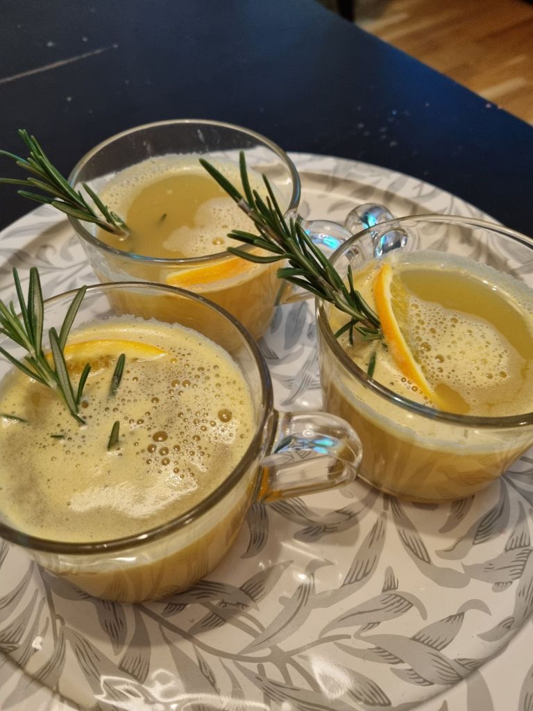 - Klicka i en liten klutt med honung i varje glas, peta i en rosmarinkvist och en skiva apelsin.