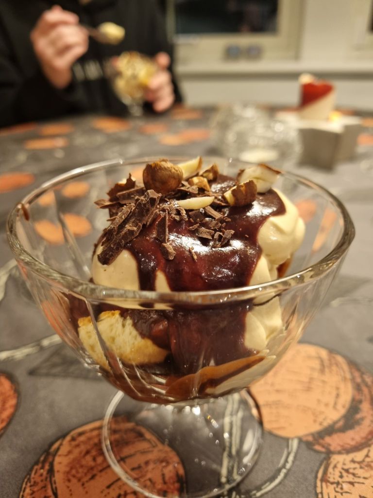 - Vispa upp resterande grädde och rör ner chokladblandningen