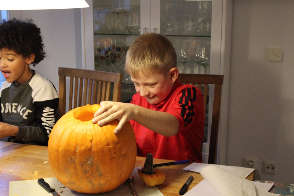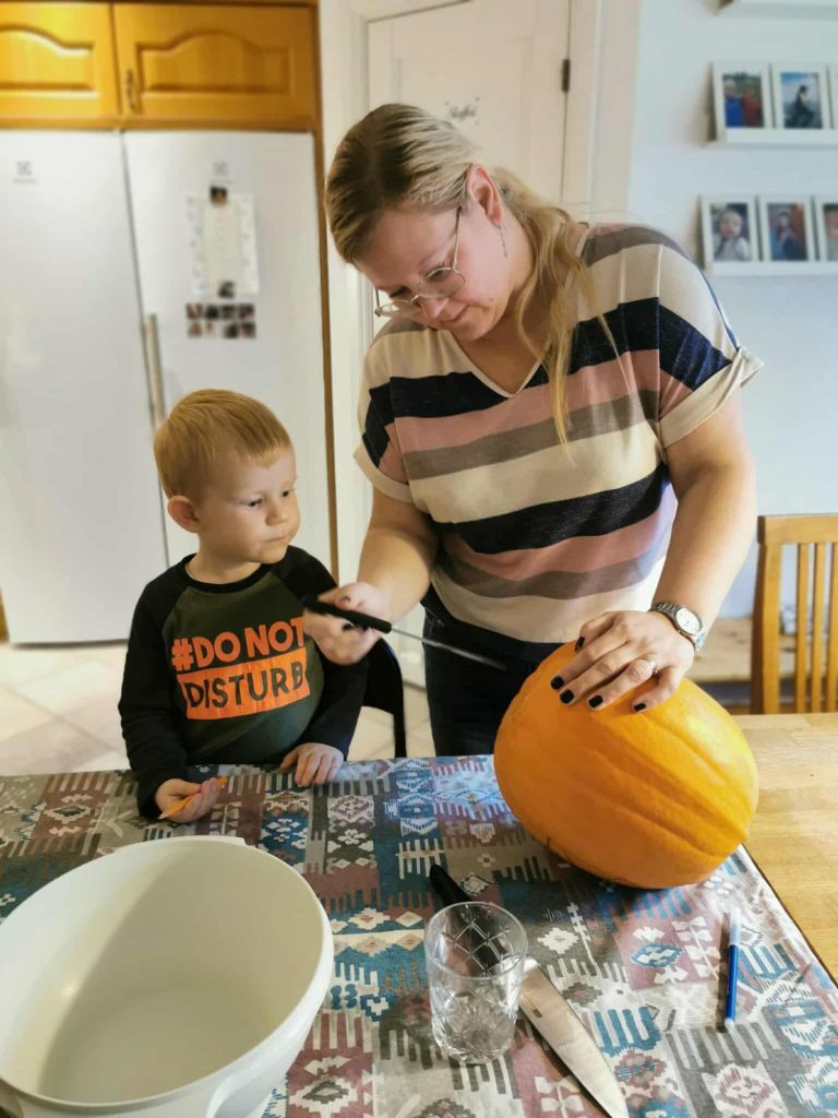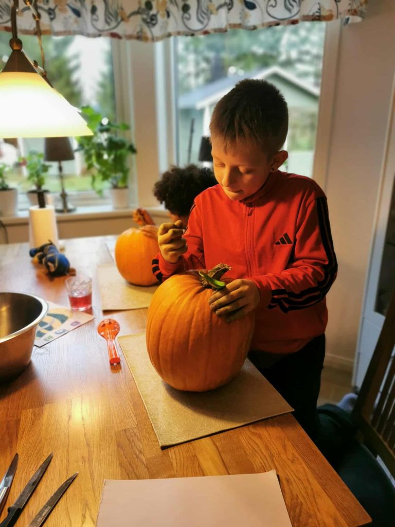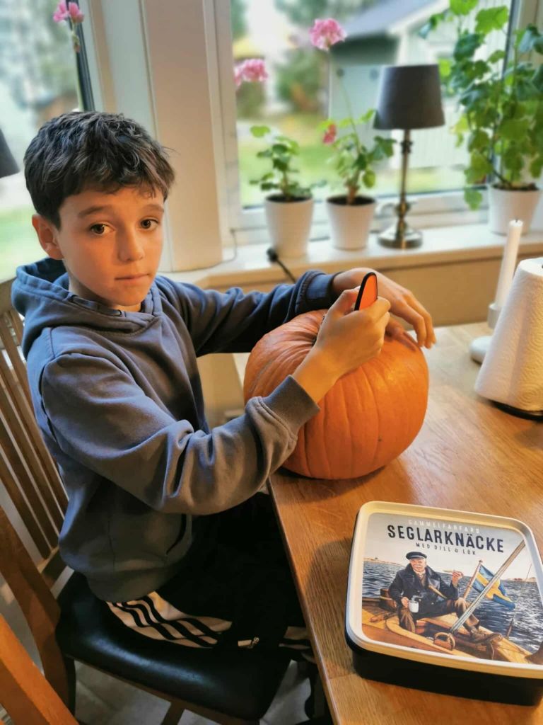 Vi började med att ses redan förra helgen för att karva pumpor. Mysig tradition där vi börjar med lite fika, för att sedan jobba på med konstverken och tillsist avsluta med en familjepizza tillsammans.