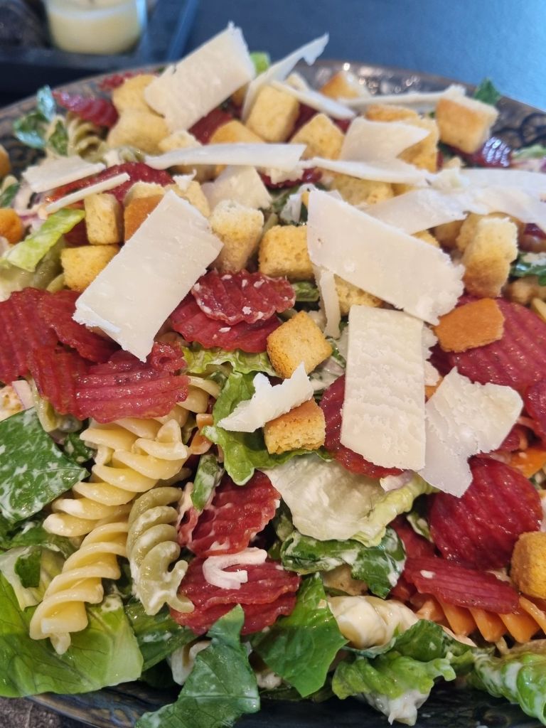 Här kommer ett tips på en pastasallad som är galet god. Hela familjen gillar den och receptet har jag fått från mamma för en massa år sedan, och sedan dess har vi lagat den flitigt.