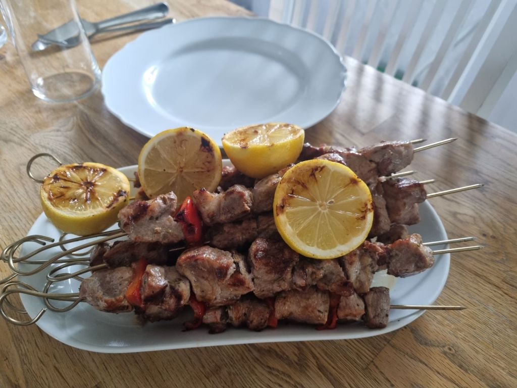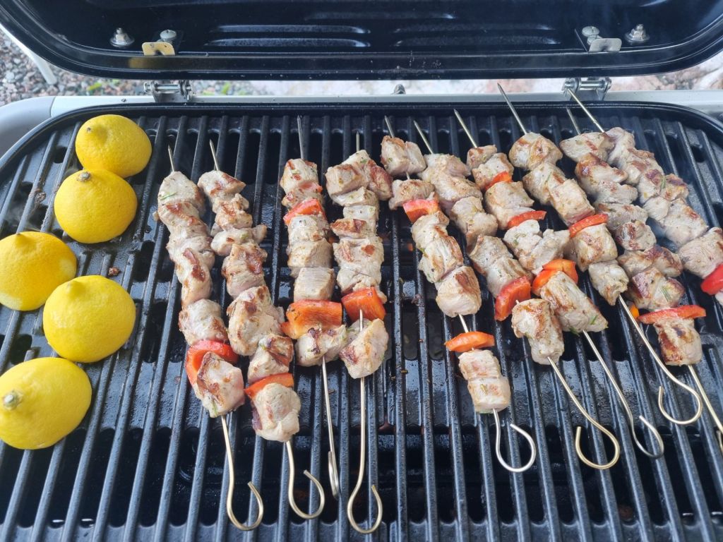 Vi grillade även citroner till vilket blir väldigt gott och fräscht. Det finns nog lika många recept och varianter på souvlaki som Grekland har öar och vi har även gjort med sojamarinad tidigare. Just det här receptet hittade jag på Matplatsens hemsida och det blev riktigt gott och bra. Doftade ljuvligt när man grillade.
