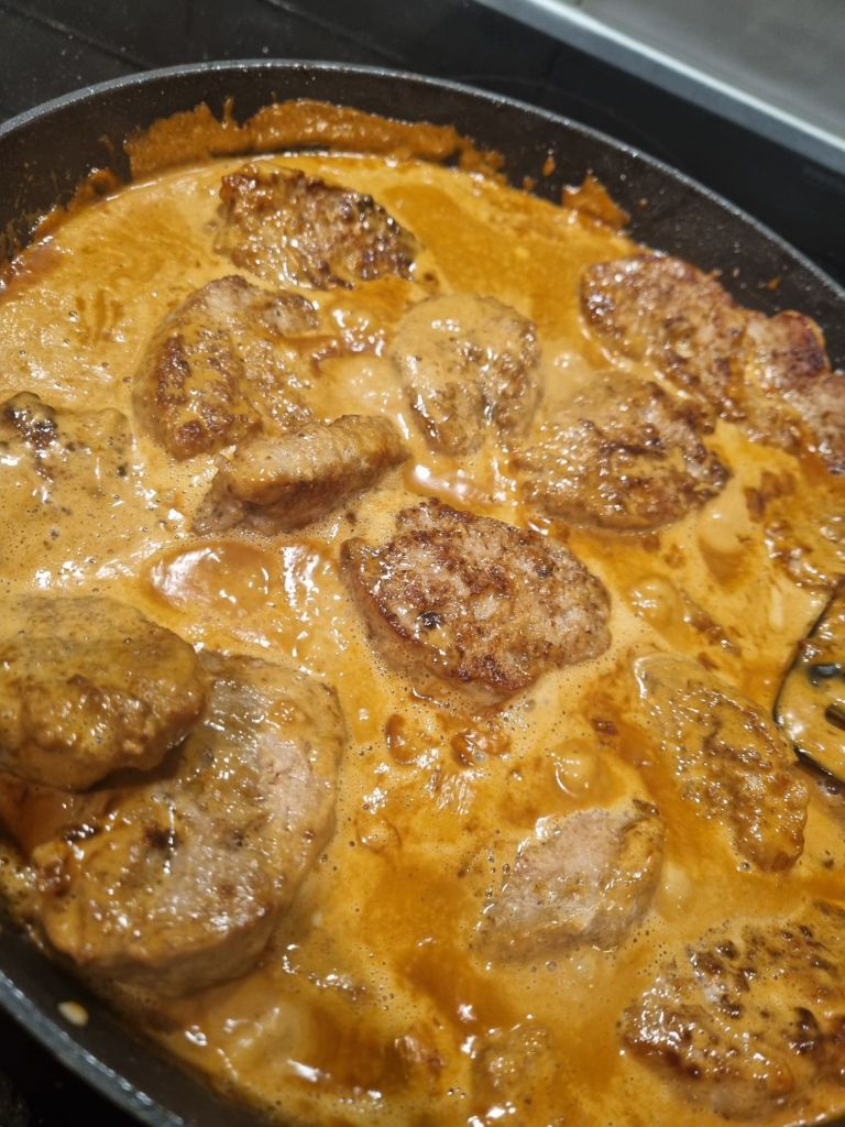 Jag hittade för ett tag sen ett spännande recept på Matplatsen.net som jag var tvungen att prova, nämligen falsk fläskfilé. Man använder sig av fläskfärs istället. Blev väldigt gott, framför allt såsen. Den blev magisk. Dock ska köttfärs-rullen vara i frysen ett par timmar så den behöver planeras lite. Men här kommer receptet: