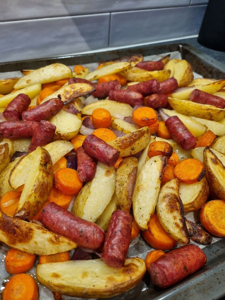 - Rosta i ugnen i ca 30 minuter. Efter 15 minuter lägger du på korvarna (jag delade den i tre ungefär)
