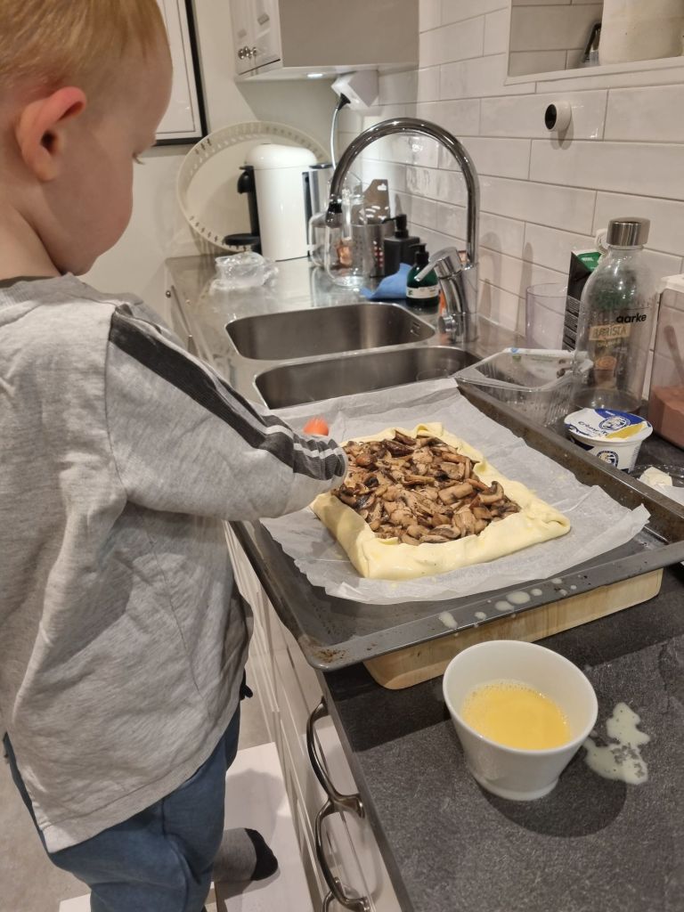 Igår hade jag hjälp i köket av en liten kille. Han tycker att det är så spännande att vara med. Frågar en massa frågor, vill veta vad allt är och hur man gör. Han fick hjälpa till att pensla pajdegen, vilket han gjorde med stor koncentration.