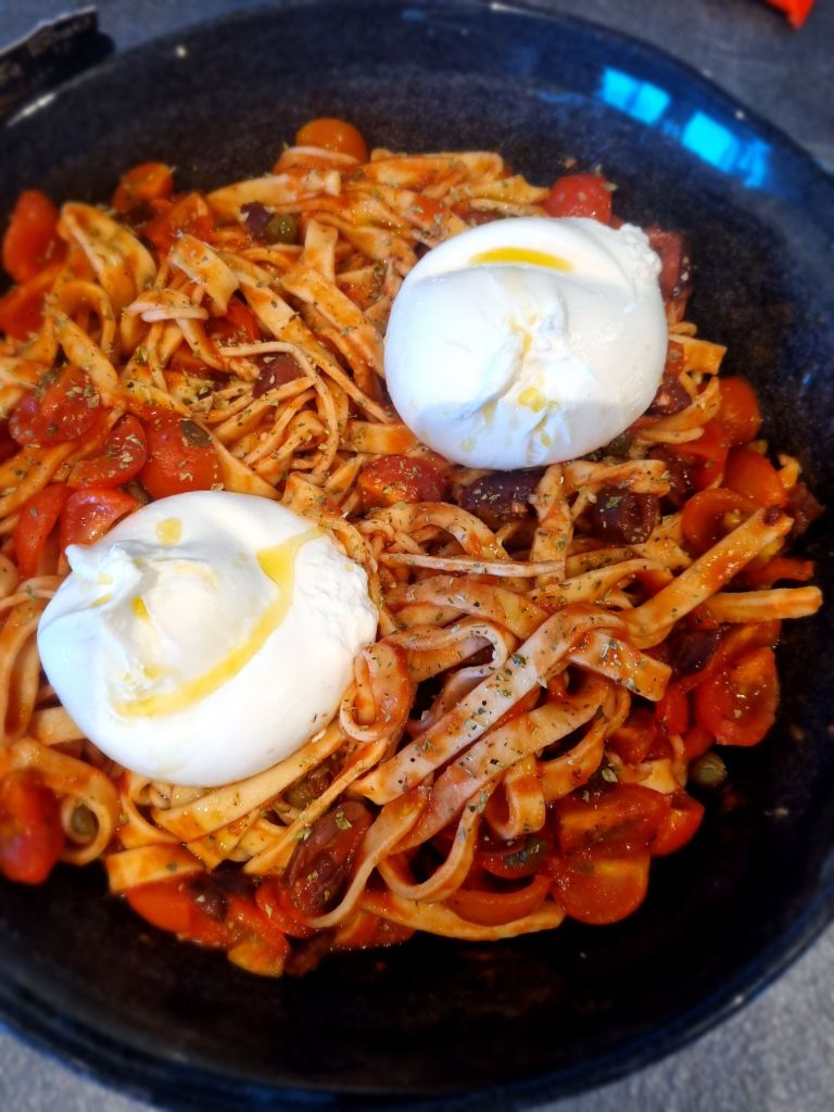 Ingredienser (4 port): 300 g pizzamjöl (t.ex tipo 00) 3 ägg 1 tsk salt Puttanescasås 2 vitlöksklyftor 4 sardelller (eller 2½ tsk sardellcréme) 2 msk olivolja 200 g körsbärstomater 2 dl passerade tomater 1 dl oliver, urkärnade 3 msk kapris salt och nymalen svartpeppar Till servering: 200 g burrata oregano 2 msk olivolja