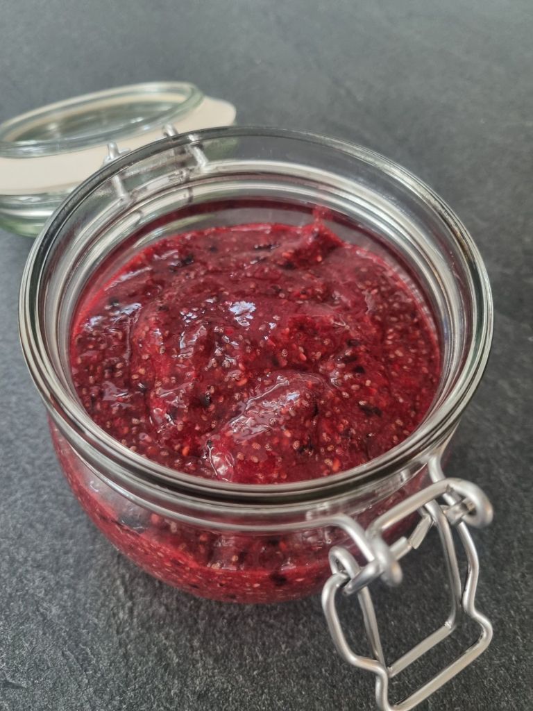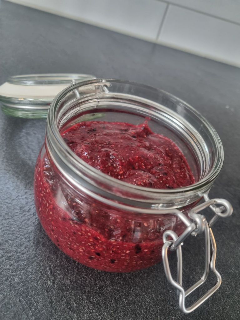 Här kommer ett tips på en sylt som man slänger ihop på bara några minuter. Jag brukar ta de bär som jag har i frysen, så den varieras lite beroende på vad som finns hemma. Dock är den väldigt god och helt fri från socker och annat. Håller ca en vecka i kylen, men hos oss tar den slut innan dess 🙂