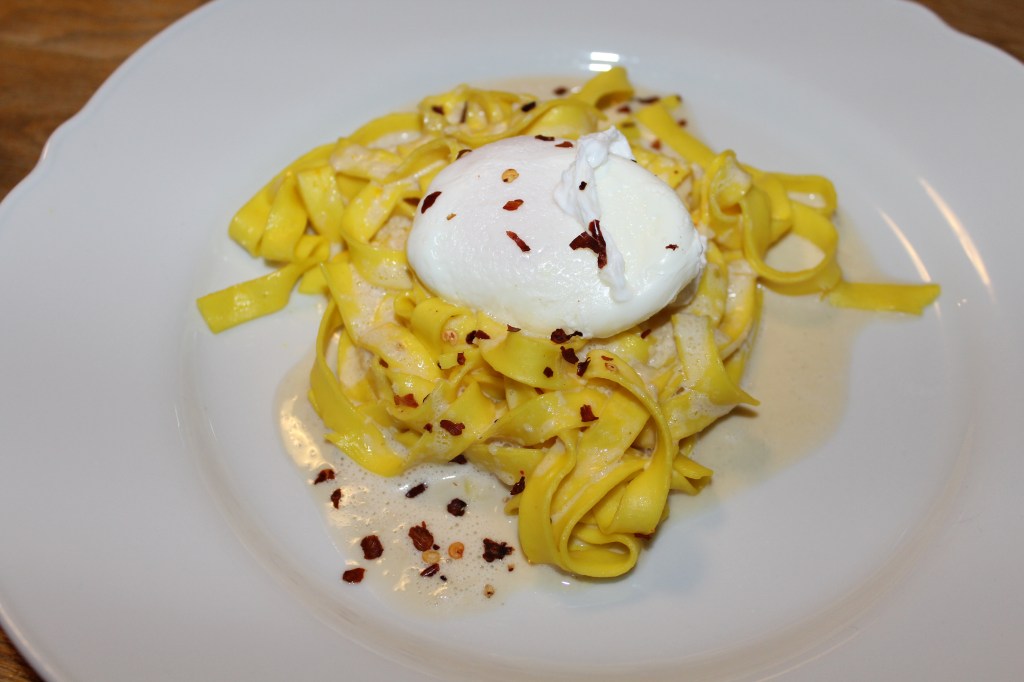 Fördela pastan på tallrikar och lägg på ett ägg.