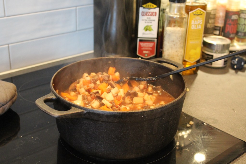 Tillsätt rotfrukterna samt svampen och stek ytterligare 5 minuter under omrörning