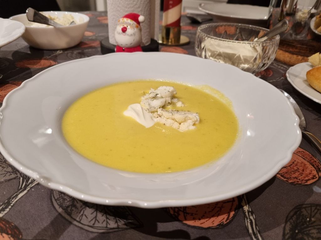Ingredienser (4 port): 2 gula lökar 3 vitlöksklyftor 400 g bakpotatis 1 blomkål olivolja till stekning 1 tsk curry ½ paket saffran 1 liter grönsaksbuljong 2 dl vispgrädde salt och nymalen svartpeppar citronsaft Blomkålstopping: ½ citron, pressad saft olivolja salt och peppar dill Till servering: bröd 2 dl crème fraiche