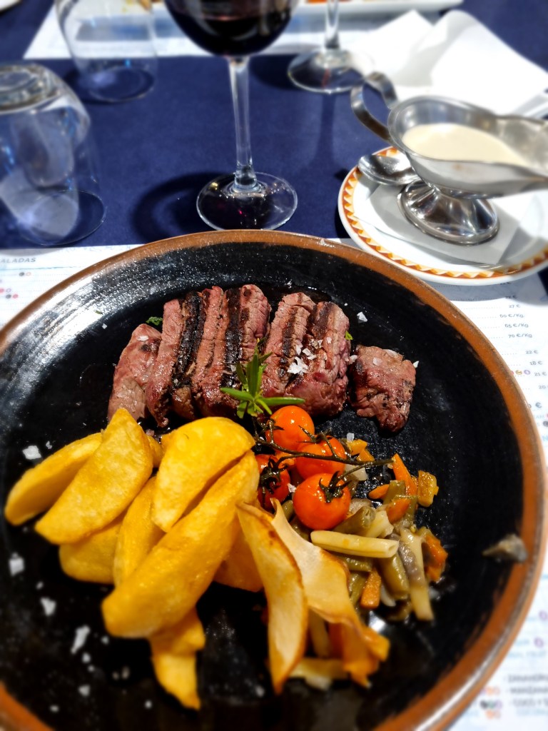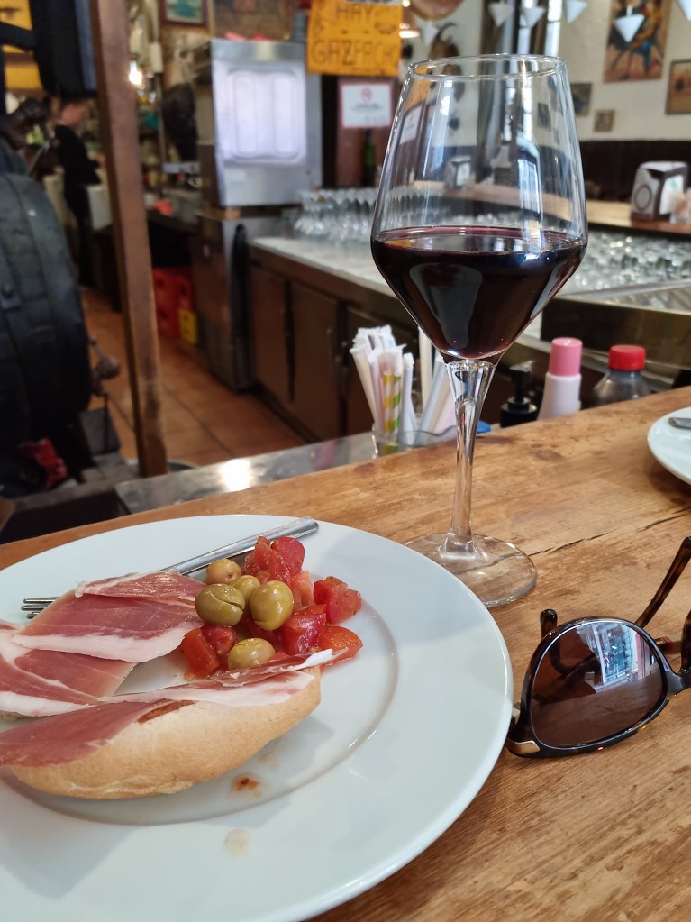 Nu är vi i lägenheten och förbereder oss för att gå ut och äta på Botos, Lukas val. Men först lite oliver och fuet, och ett glas vin. Välförtjänt efter att ha kört bil i det här landet 😂