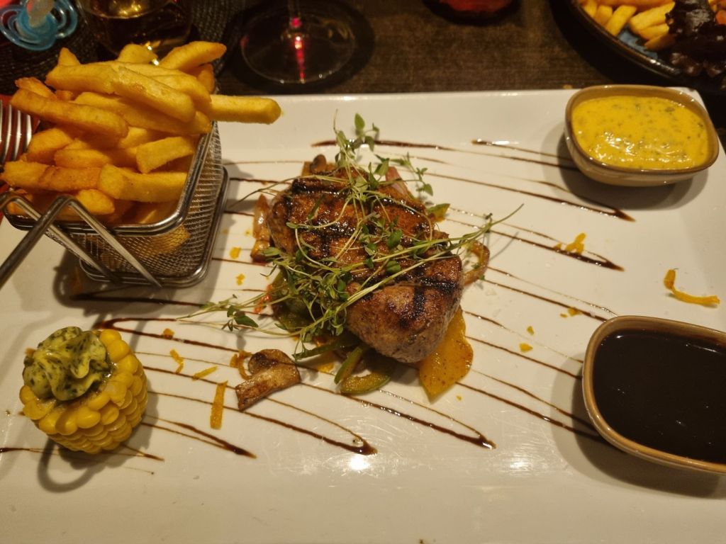 Vi åt på ett steakhouse i närheten, väldigt gott var det. Uppskattades av hela familjen. Jag åt en oxfilé som var väldigt mör och god.