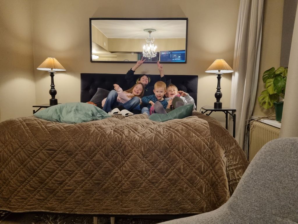 Vi hade dock bokat lite innan och istället för en cell hade vi en liten studio. Vårt rum var med andra ord enormt i jämförelse och här är alla barnen i våran säng och busar. Vi hade sån tur att vi fick bo på samma våning som den familj som vi reste med, så barnen kunde enkelt springa över till varandra. Så det sprangs en hel del, med nävarna fulla i godispåsar 🙂