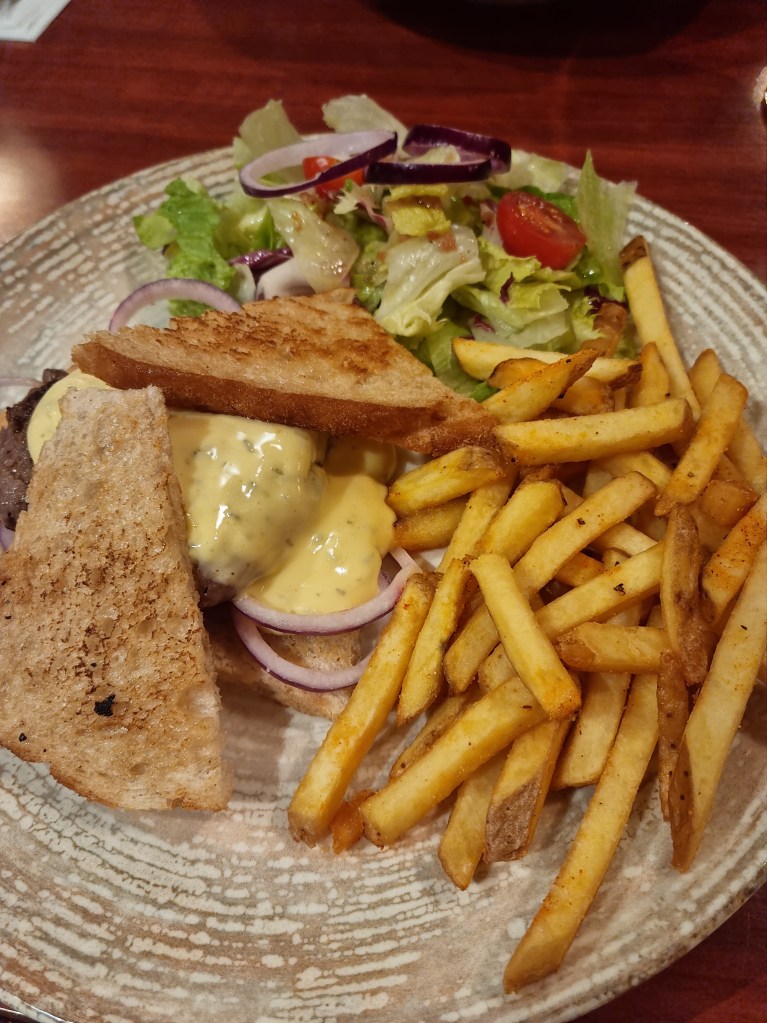 Vi åt på ett steakhouse i närheten, väldigt gott var det. Uppskattades av hela familjen. Jag åt en oxfilé som var väldigt mör och god.
