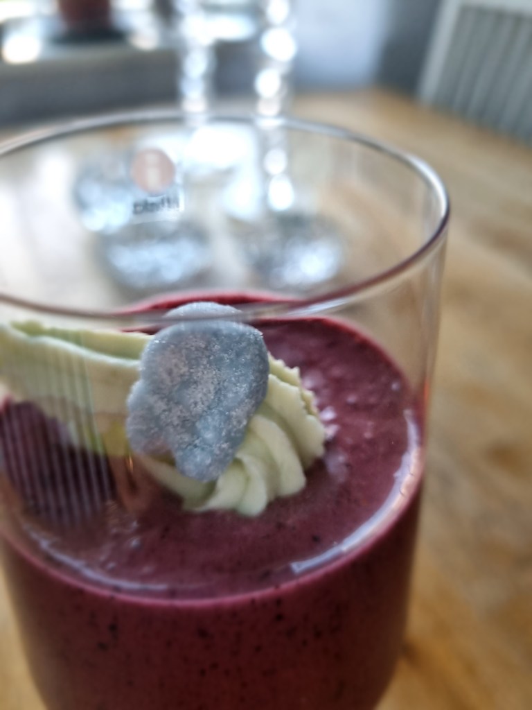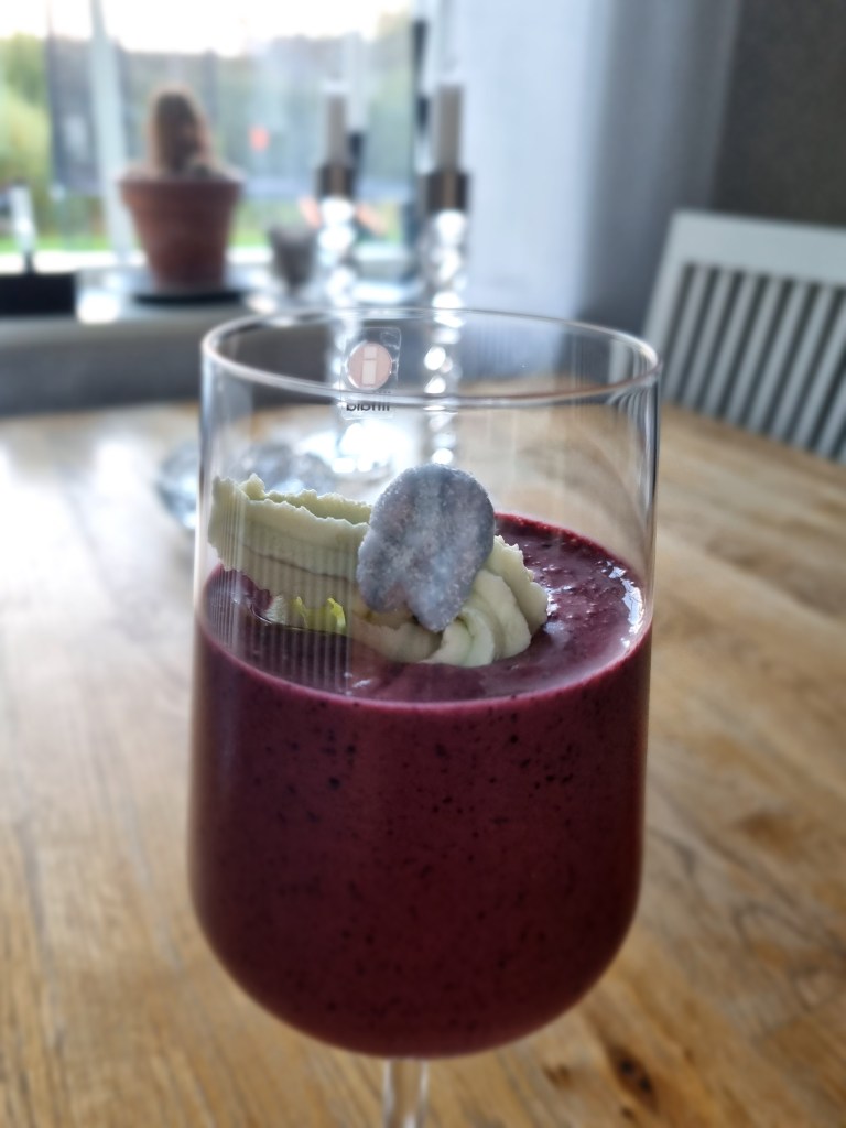 Fyll upp blandningen i glas och toppa med godisgrädde. Dekorera med en blåbärsskalle på toppen.