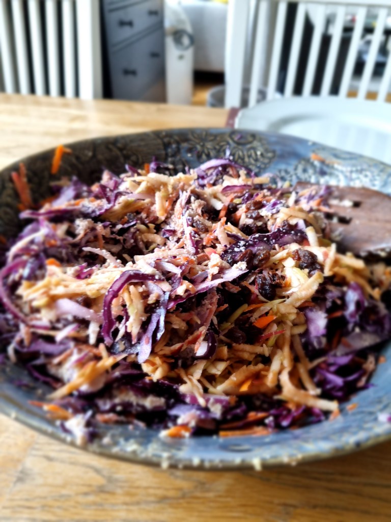 Till middagen gjorde jag en coleslaw med rödkål och morot. Så gott.