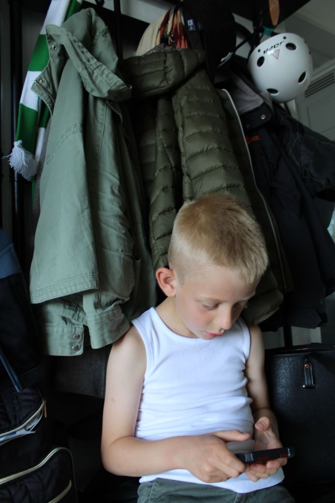 Min äldsta som tålmodigt väntar på att glassen ska serveras, inklämd bland jackor och halsdukar. Halsduken är för vårt lokala fotbollslag så jag har inte glömt att städa undan vinterkläderna 🙂