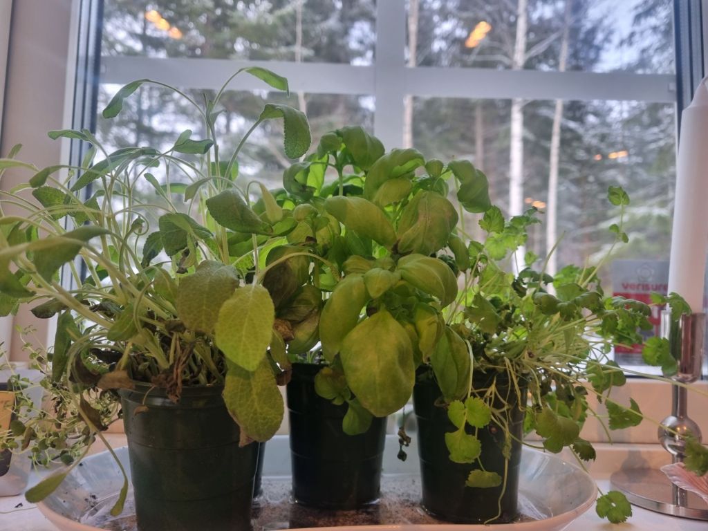 Ett tips som jag läste för ett tag sen är att sätta sina köpta örter på ett fat och hälla på vatten. Då tar de upp det vattnet de behöver och håller sig fräscha mycket längre. Vilket är ganska mycket, för jag får fylla på i stort sett dagligen. Just nu har jag timjan, salvia, basilika och koriander i mitt örtskafferi.